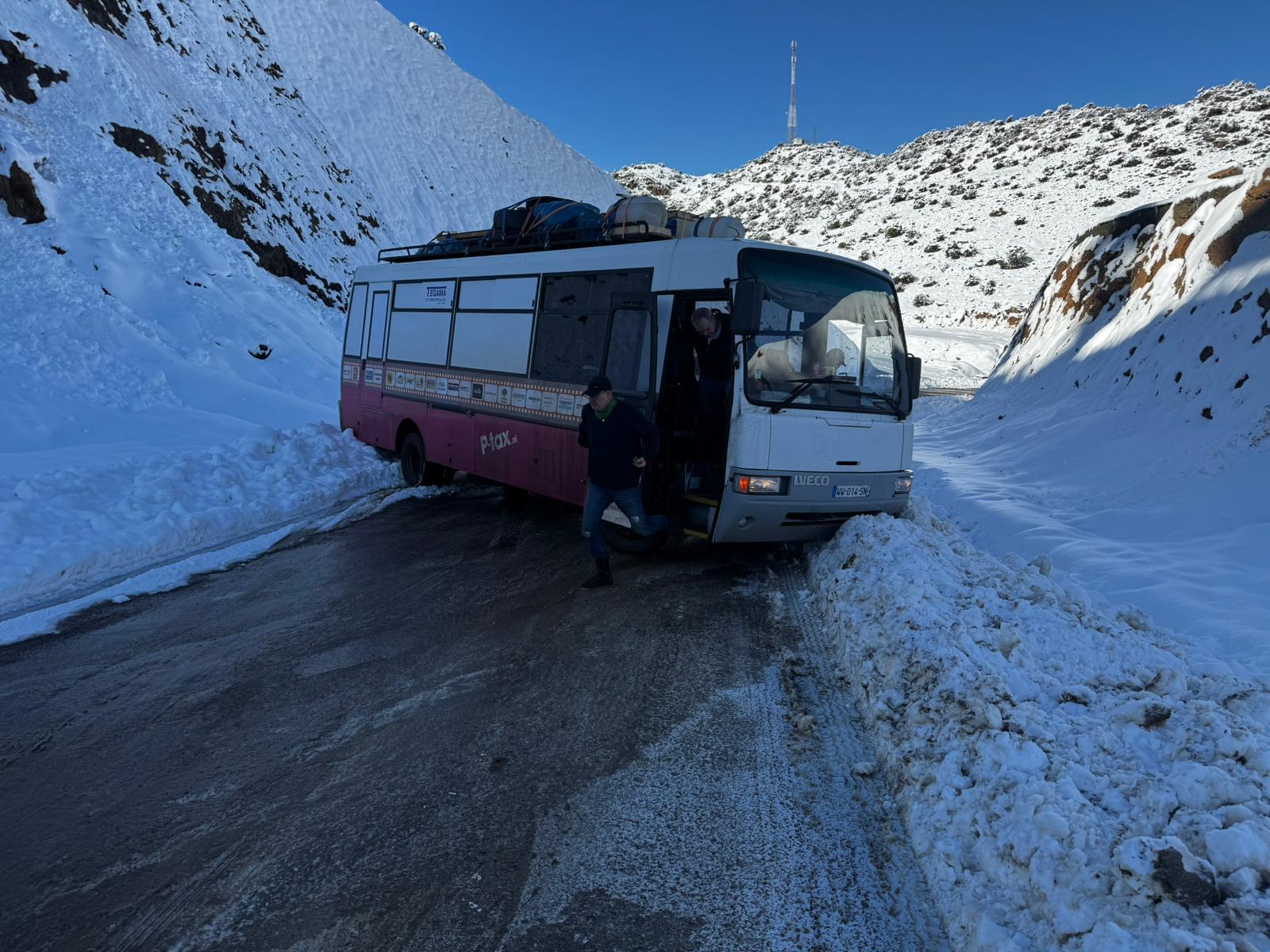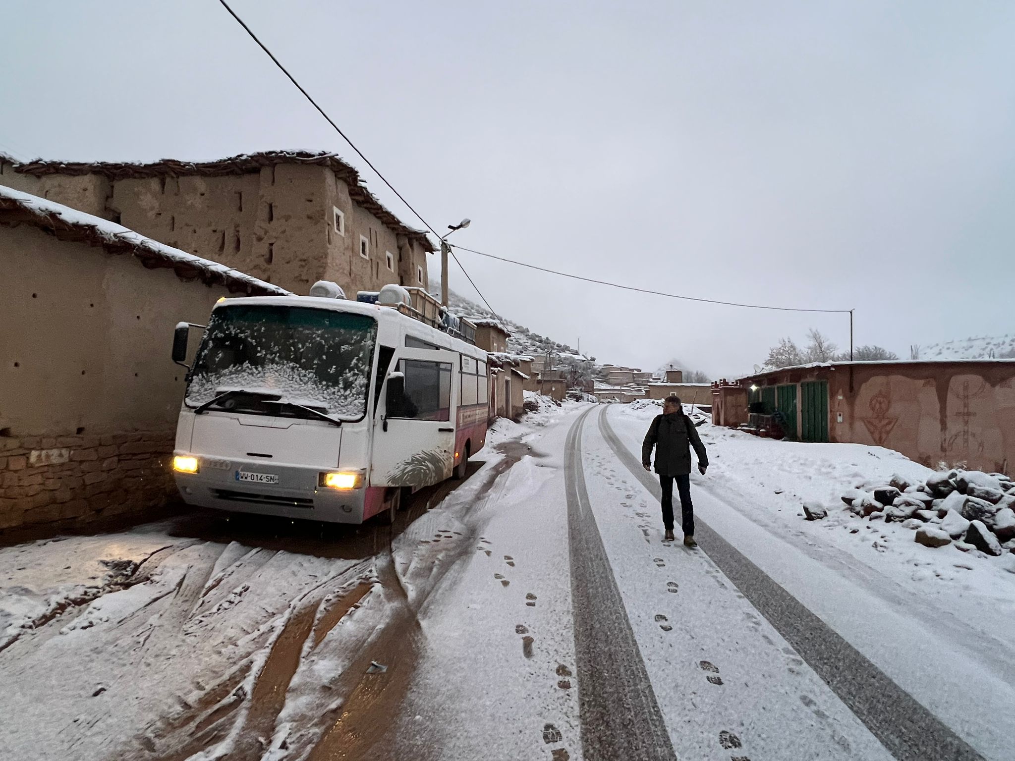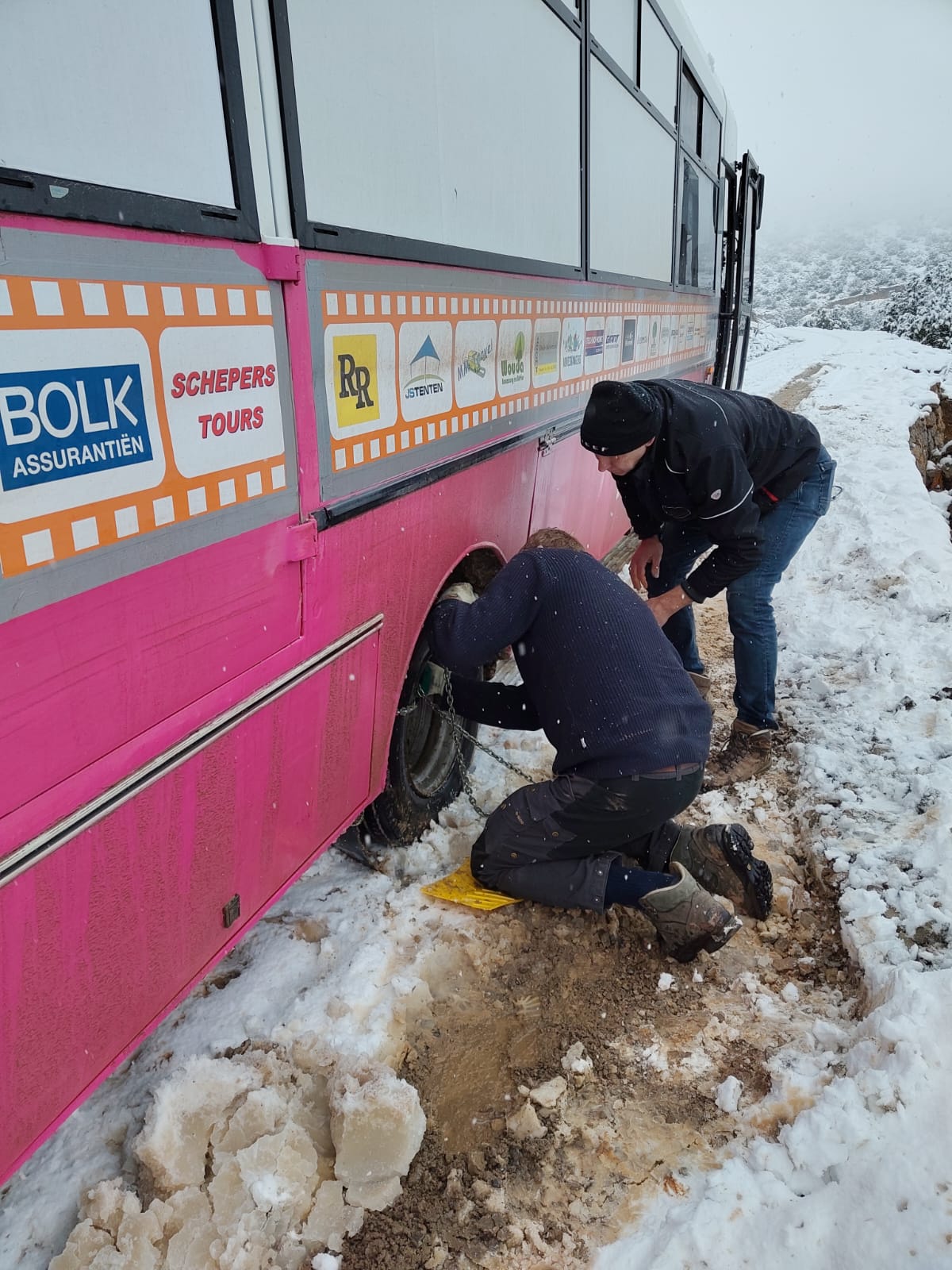 We rijden een eind terug en proberen een derde route, over een pasweg naar Azilal. Inmiddels is het een uur of 11. Het is nog steeds grijs en het is gaan regenen. Iets hoger wordt dat sneeuw. De weg is nog niet geprepareerd en wordt slechter en slechter tot we op 1800 meter hoogte vast komen te zitten in sneeuw en ijs. We moeten nog tot een hoogte van 2240 meter, dus voorlopig lukt dat niet. Met kunst- en vliegwerk weten we de bus te keren op het smalle pad en rijden en glijden we voorzichtig terug naar het dorpje Tamernout. Daar wachten we een paar uur bij een garage waar wat trekkers en graafmachines staan. Via onze perfecte wifi (Starlink; bedankt Jos!) houden we het nieuws en het weer in de gaten. We vullen ook diesel bij uit onze voorraad, want tankstations zijn hier niet. Om 14 uur breekt de zon door en wat later horen we in het dorpje dat er inmiddels een sneeuwploeg over de weg is geweest. Om 15 uur wagen we een tweede poging. De weg is inderdaad beter en langzaam maar zeker komen we omhoog. Halverwege doen we kettingen om – sneeuwkettingen hebben we niet, maar een lange schakelketting die je door de velggaten over het wiel trekt en vastzet met een hangslotje doet het ook goed. Op de gladste stukken gebruiken we plastic rijplaten, ook een waardevol bezit hier. En als het nodig is gebruiken we schoppen om sneeuw en ijs weg te halen. Daar hadden we ze niet voor meegenomen, maar ze komen prima van pas. Zo vorderen we langzaam maar zeker. Vlak onder de top moeten we nog één keer alle zeilen bijzetten. De bus slipt weg op het ijs en we moeten ‘m weer vrij maken. Ook dat lukt en om 17 uur bereiken we de top!