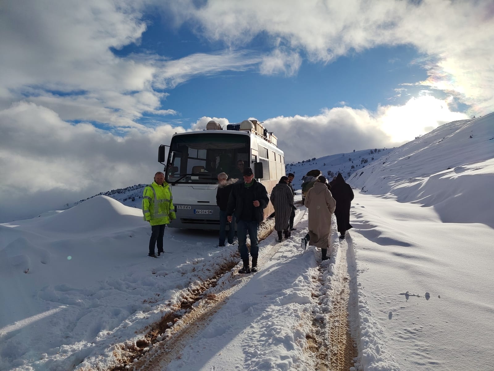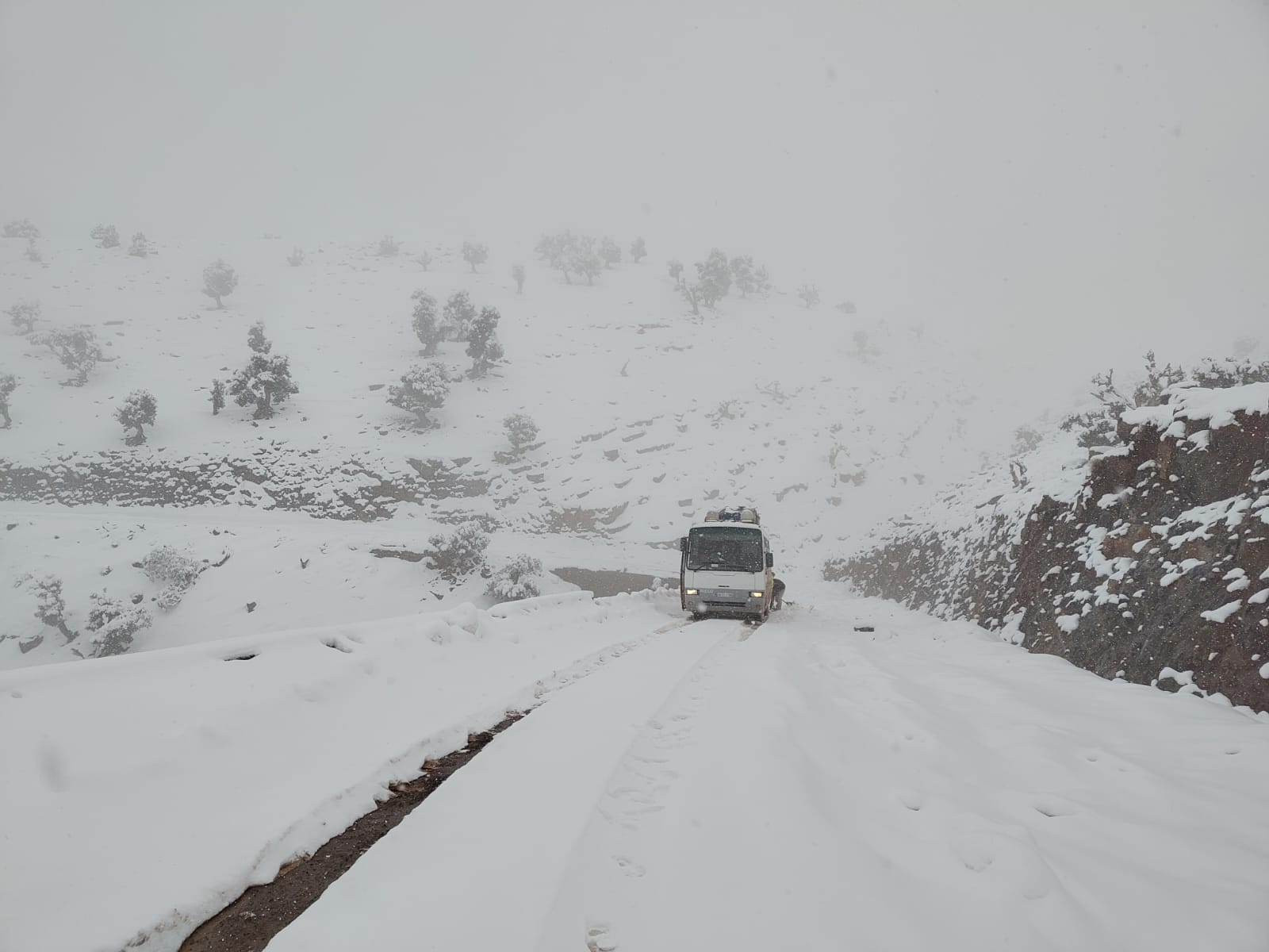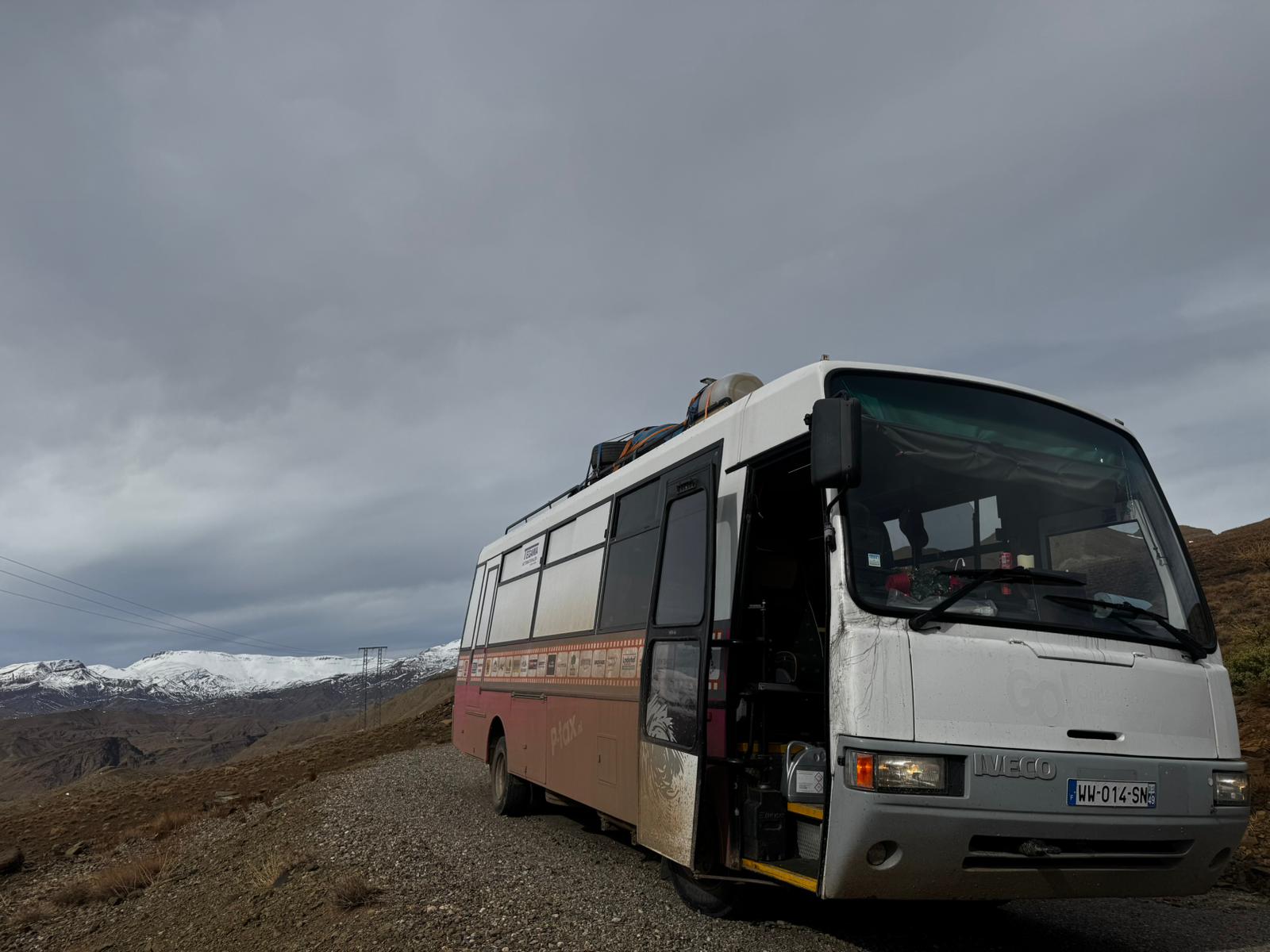 We rijden een eind terug en proberen een derde route, over een pasweg naar Azilal. Inmiddels is het een uur of 11. Het is nog steeds grijs en het is gaan regenen. Iets hoger wordt dat sneeuw. De weg is nog niet geprepareerd en wordt slechter en slechter tot we op 1800 meter hoogte vast komen te zitten in sneeuw en ijs. We moeten nog tot een hoogte van 2240 meter, dus voorlopig lukt dat niet. Met kunst- en vliegwerk weten we de bus te keren op het smalle pad en rijden en glijden we voorzichtig terug naar het dorpje Tamernout. Daar wachten we een paar uur bij een garage waar wat trekkers en graafmachines staan. Via onze perfecte wifi (Starlink; bedankt Jos!) houden we het nieuws en het weer in de gaten. We vullen ook diesel bij uit onze voorraad, want tankstations zijn hier niet. Om 14 uur breekt de zon door en wat later horen we in het dorpje dat er inmiddels een sneeuwploeg over de weg is geweest. Om 15 uur wagen we een tweede poging. De weg is inderdaad beter en langzaam maar zeker komen we omhoog. Halverwege doen we kettingen om – sneeuwkettingen hebben we niet, maar een lange schakelketting die je door de velggaten over het wiel trekt en vastzet met een hangslotje doet het ook goed. Op de gladste stukken gebruiken we plastic rijplaten, ook een waardevol bezit hier. En als het nodig is gebruiken we schoppen om sneeuw en ijs weg te halen. Daar hadden we ze niet voor meegenomen, maar ze komen prima van pas. Zo vorderen we langzaam maar zeker. Vlak onder de top moeten we nog één keer alle zeilen bijzetten. De bus slipt weg op het ijs en we moeten ‘m weer vrij maken. Ook dat lukt en om 17 uur bereiken we de top!