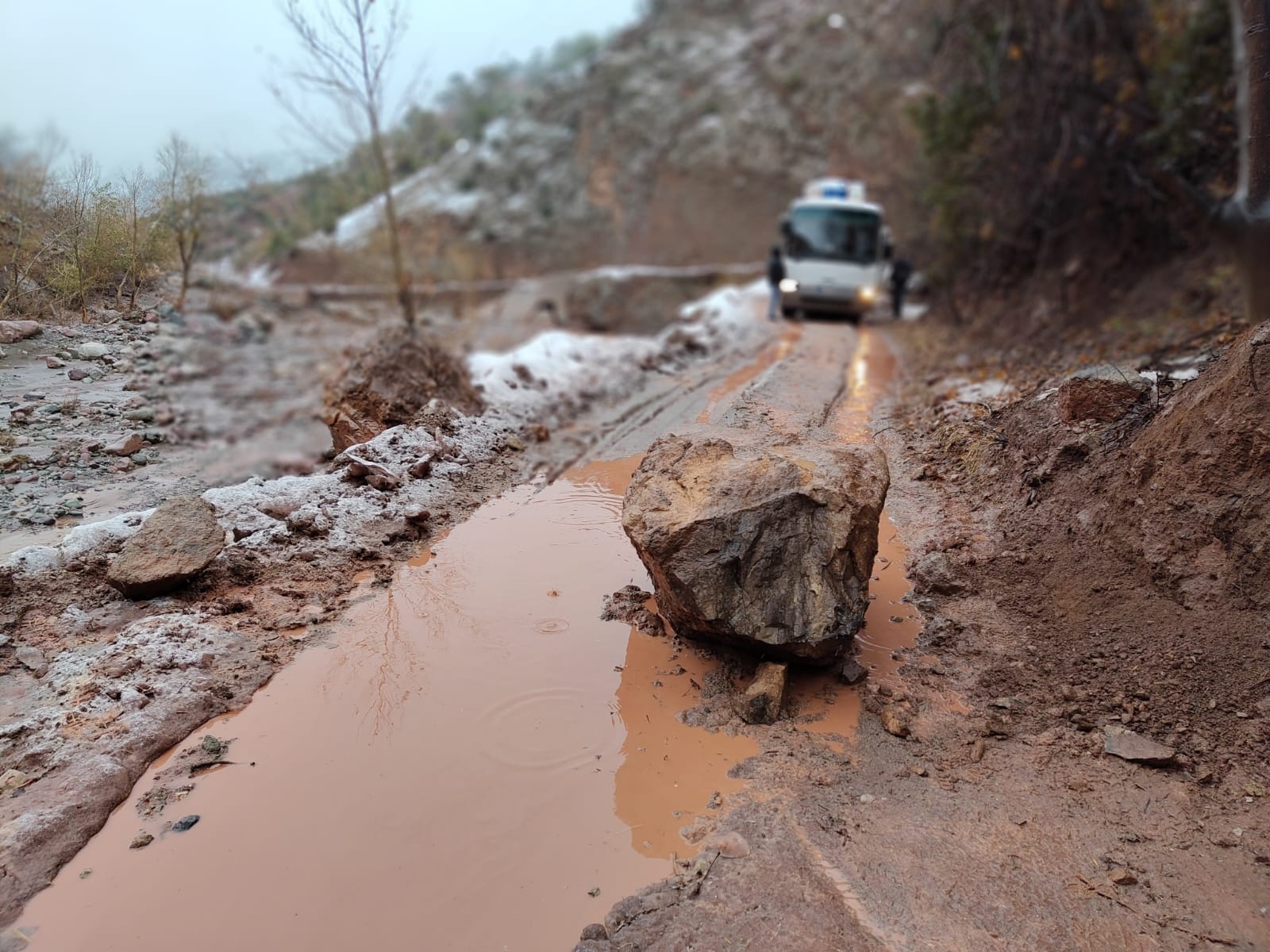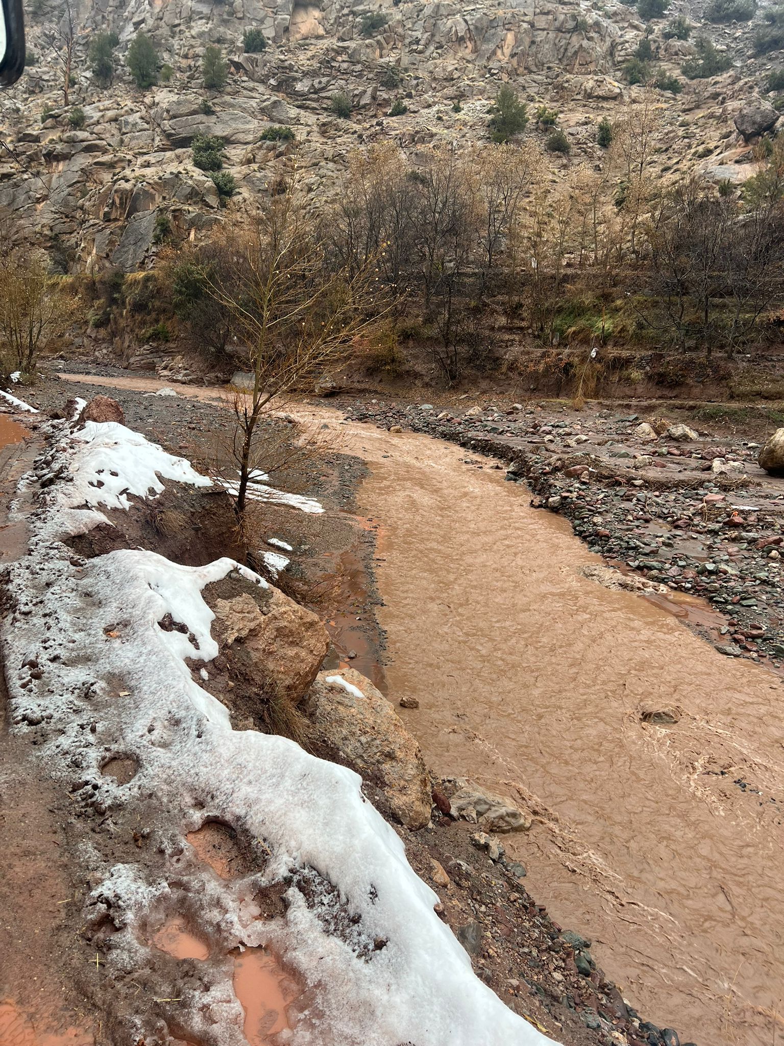 We rijden nu richting Demnate voor een alternatief. Maar ook die weg is behoorlijk gehavend door het slechte weer van de afgelopen tijd. Hier en daar zijn er stukken weggespoeld en er liggen keien op de weg. Een paar keer moeten we stoppen om die eerst weg te halen. Uiteindelijk komen we bij Ighir n’Tissent op een plek die helemaal dicht zit. Door een aardverschuiving vanwege de vele regen zijn er rotsen los gekomen en is de hele weg onbegaanbaar geworden. Dat wordt keren en iets anders proberen.
