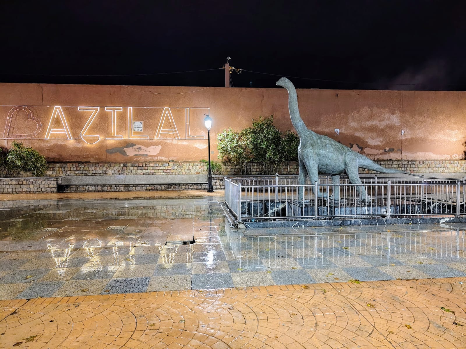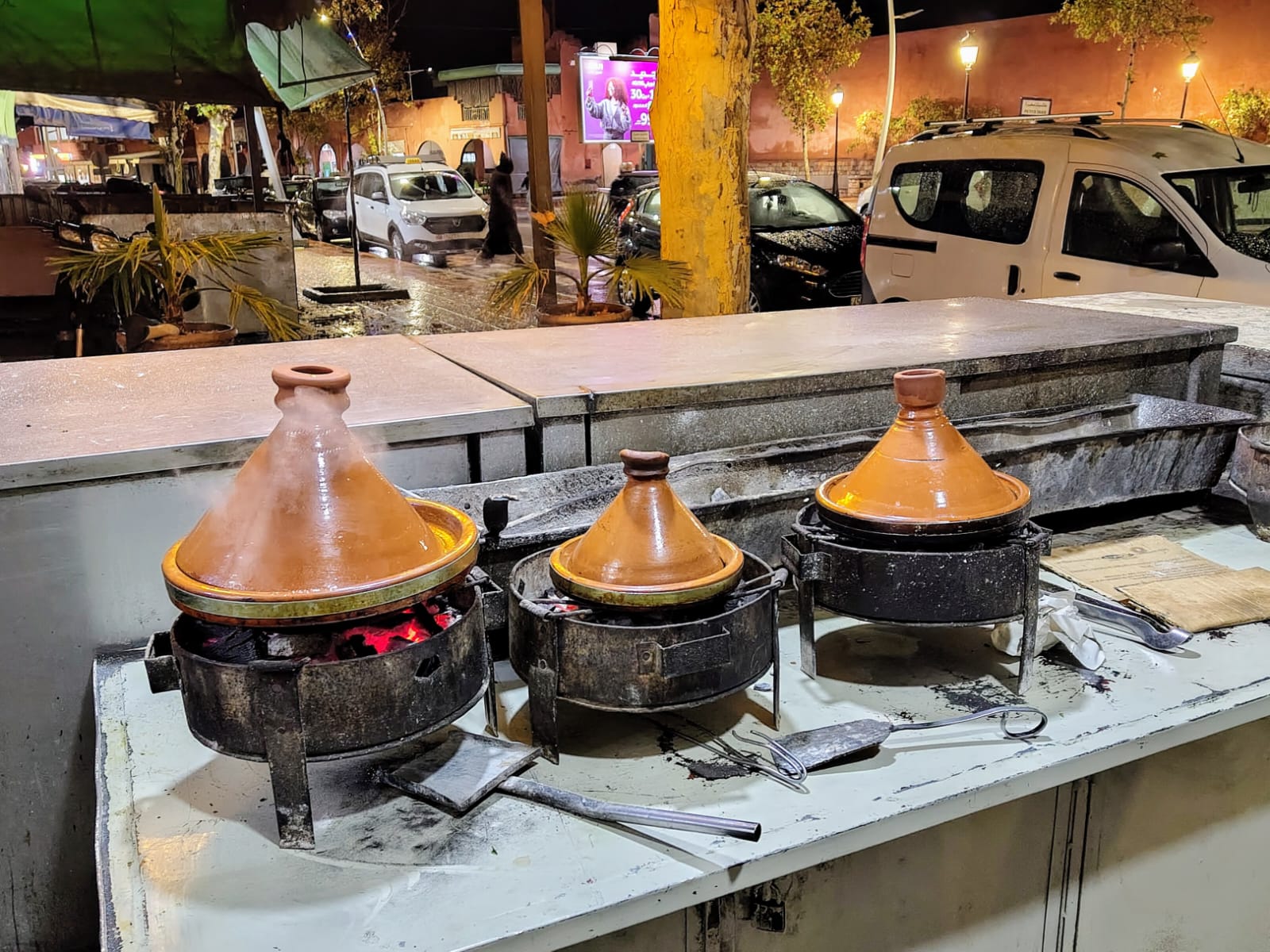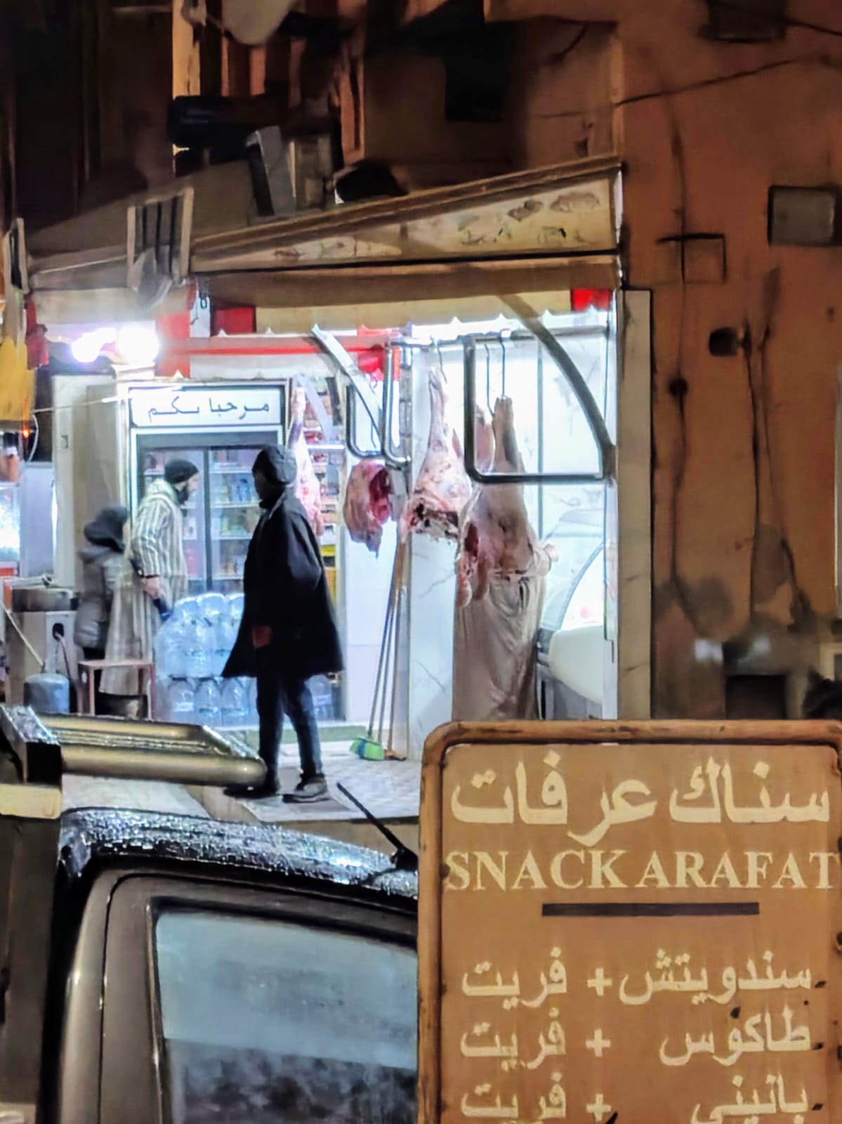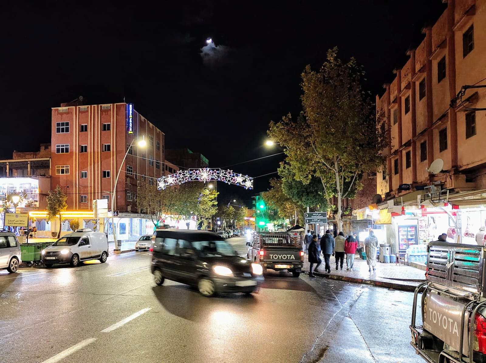Nu nog omlaag. Rustig aan zetten we de afdaling in, eenmaal lager is het gedaan met sneeuw en gladheid en om 19 uur rijden we Azilal binnen, een stad op 1300 meter. Daar zijn voldoende tankstations om de tank en jerrycans weer bij te vullen. Bovendien zijn er ook een paar hotels in de stad. We checken in bij Hotel ‘Le Ruban d’or’ waar we zeer vriendelijk worden ontvangen. Voor 95 Euro hebben we twee prima kamers voor in totaal 5 personen. En het belangrijkste voor ons: met goede warme douches erbij. De andere 3 personen blijven in de bus slapen. We krijgen nog een tip mee voor een goed restaurant iets verderop in de stad, waar we naartoe wandelen. Nogal een sfeerloze bedoening, maar de pizza’s en het andere eten smaken goed. Voor 38 Euro zijn we klaar met zijn achten. Inclusief fooi. Op de 3-persoonskamer is het ruim groot genoeg om met zijn achten de dag nog eens door te nemen met een kruidenbittertje erbij.