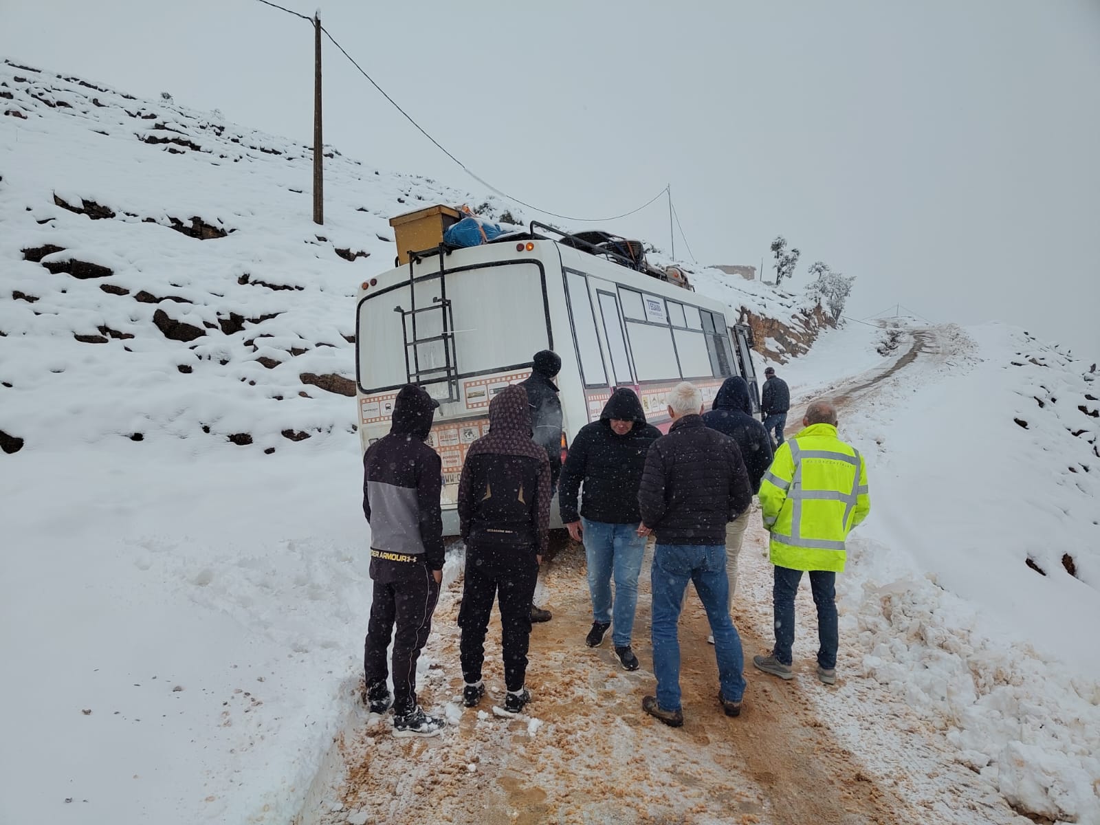 We zitten om half acht aan het uitgebreide ontbijt van Gite Paradise. Er is koffie, thee, smoothie, jam en honing, eieren, brood en pannenkoekjes. Wij vinden het een prima kerstontbijt. Sowieso hebben ze hier op 1900 meter een witte kerst dit jaar. Om 8.15 uur starten we de bus en nemen we afscheid. Volgens de hoteleigenaar is de pashoogte die we willen nemen voor 100% zeker dicht door de sneeuw. We proberen het toch een stukje tot aan het plaatsje Tabant, waar we bij de plaatselijke middelbare school van de schoolbuschauffeurs horen dat het inderdaad niet mogelijk is. Onze eerste keus valt daarom af.