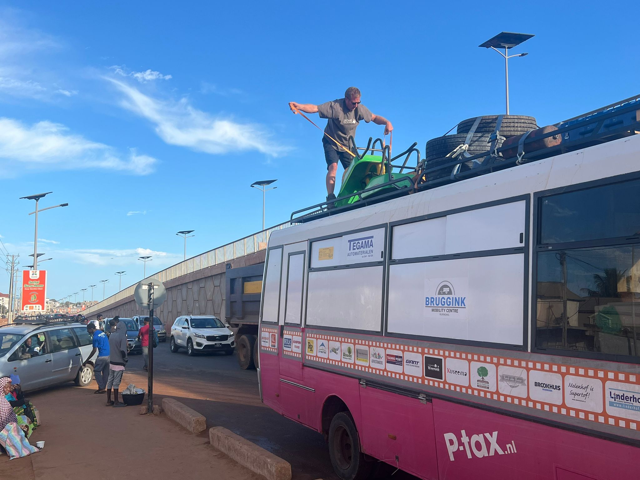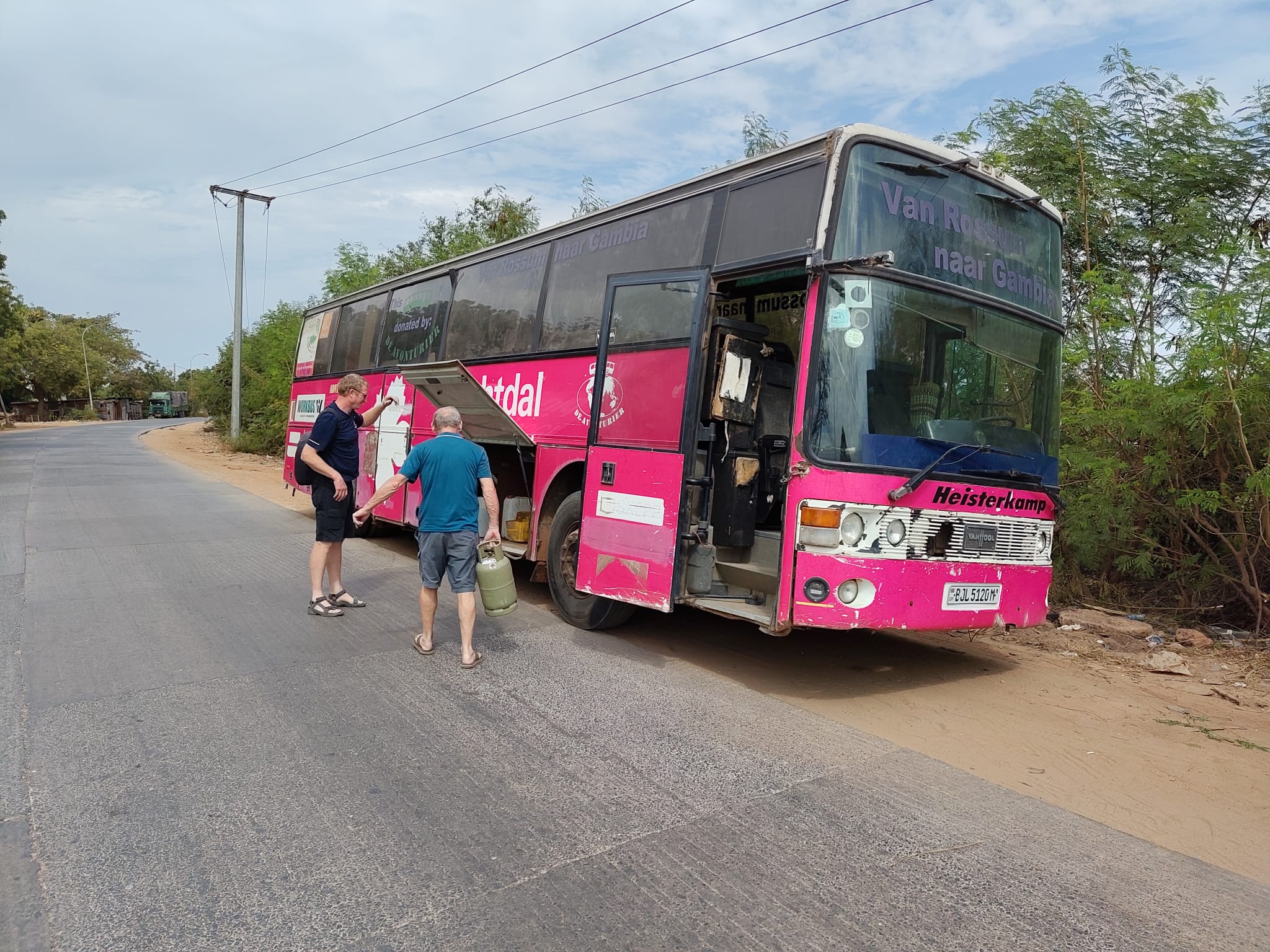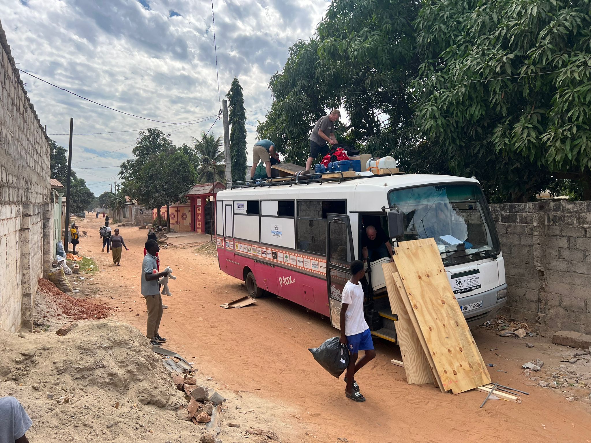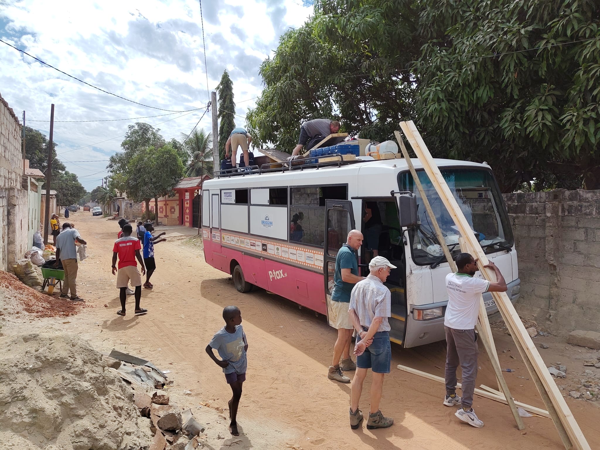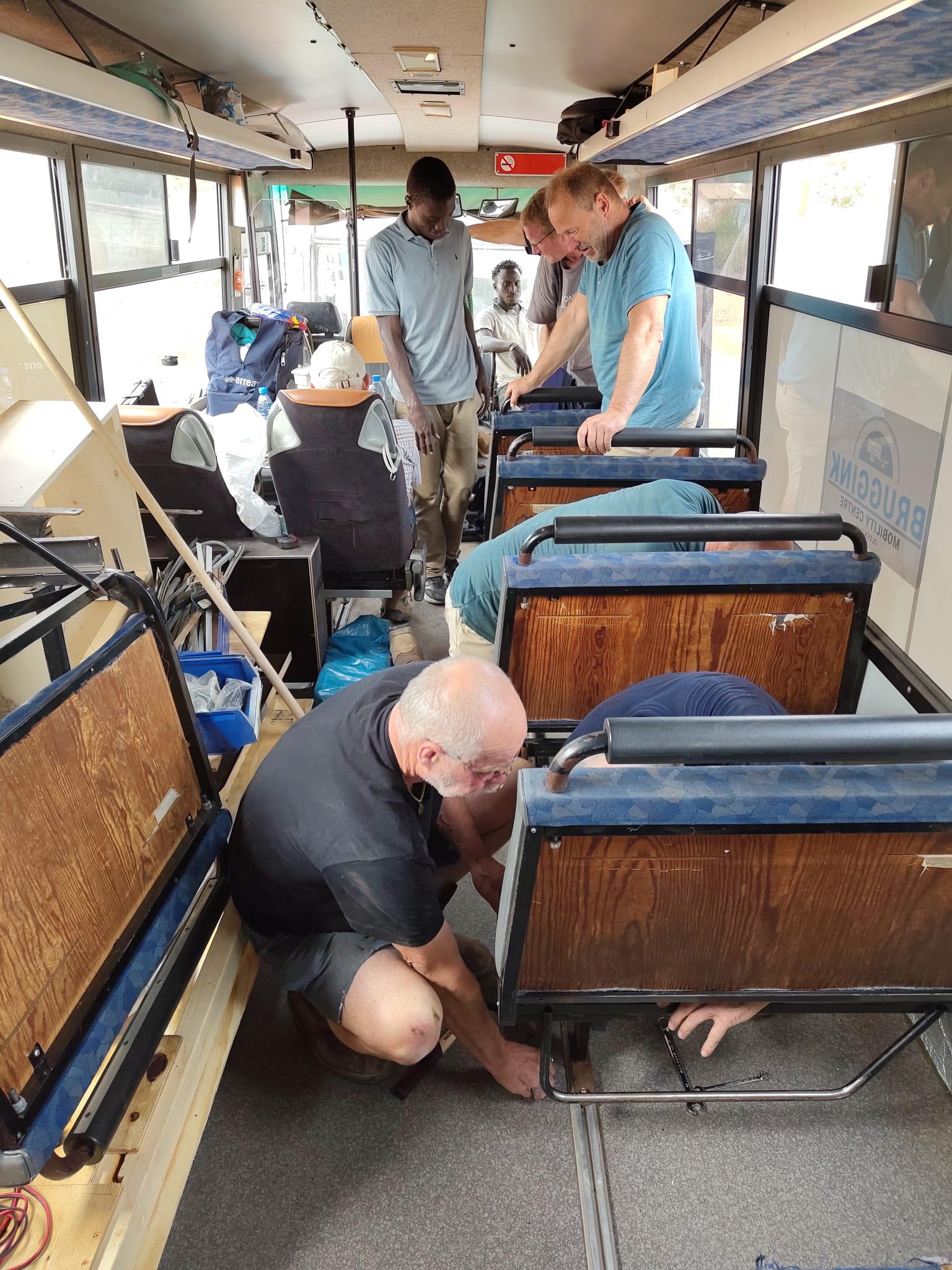- Toen de nieuwe bus werd vrijgegeven en we die konden meenemen hadden we tijd om ‘m uitgebreid te verbouwen. De bedden gaan eruit en de bankjes komen er weer in. Al het materiaal dat over is, zoals het hout van de bedden, de matrassen, onderdelen van de bus, etc., hebben we naar de Da Vinci school in Serekunda gebracht. Daar kan het worden gebruikt of in de opslag.