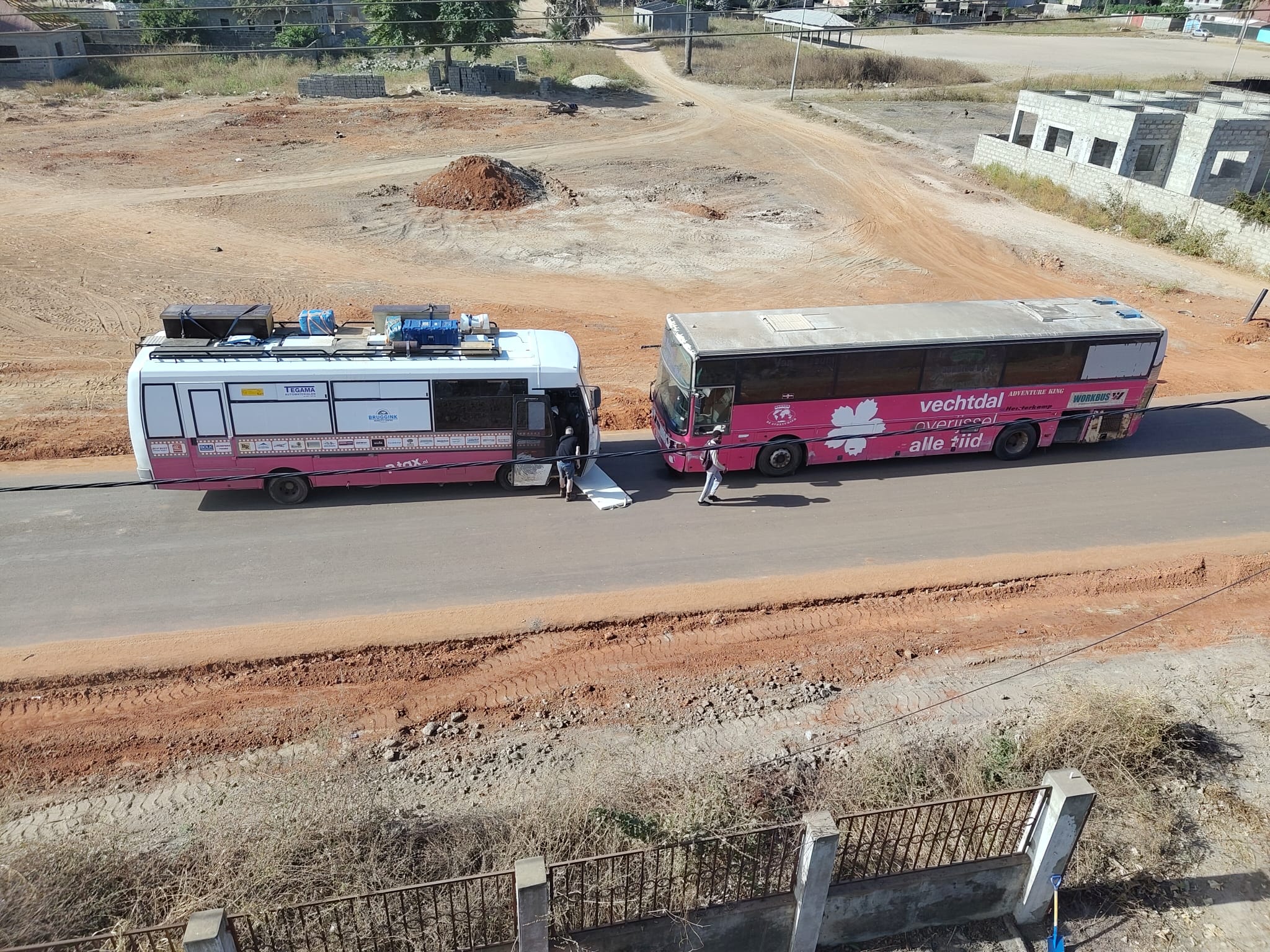 - De bus heeft een paar dagen bij de ‘import’ parkeerplaats gestaan, achter een hek. Daar staan alle import auto’s totdat de formaliteiten zijn afgehandeld. Dat zijn er honderden. Ter plekke hebben we veel materiaal uit onze ‘nieuwe’ bus overgeladen in de ‘oude’ bus, die we hier in 2017 hebben gebracht. De oude rijdt nog wel, maar is behoorlijk aan zijn eind. De nieuwe bus kunnen ze dus heel goed gebruiken.